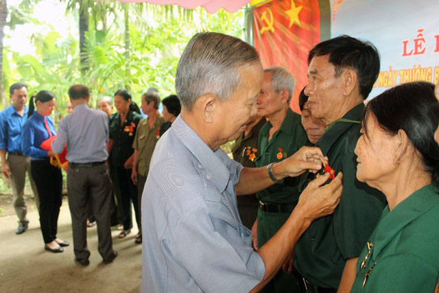Các đồng chí Huỳnh Văn Be, Phan Văn Mãi trao huy hiệu Đảng và tặng quà cho cựu TNXP