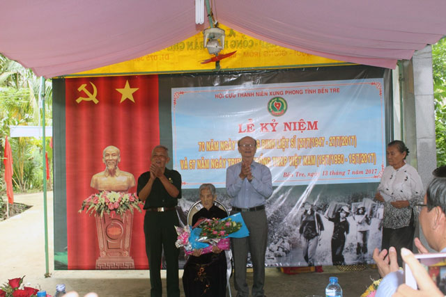 Các đồng chí Trần Văn Mãnh, Phạm Hữu Thừa tặng hoa cho bà Phan Thị Vững, mẹ Anh hùng liệt sỹ Lê Trung Kiên