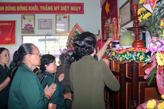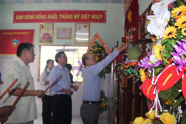 Đại biểu lãnh đạo, các cô chú cựu TNXP thắp hương tại nhà Anh hùng Lê Trung Kiên