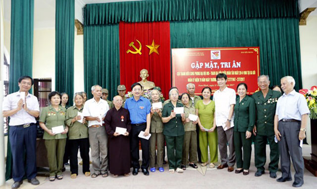 Đại diện các nhà tài trợ và lãnh đạo Báo Tiền Phong tặng quà cho các cựu TNXP Đại đội 895.