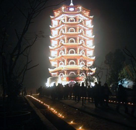 Tháp chuông Đồng Lộc (ảnh trên) được khánh thành ngày 2/1/2011. Tháp cao 37m, gồm 7 tầng, 8 mái, hình bát giác đều, kết hợp, khai thác theo hình thức đài tháp và lầu vọng cảnh truyền thống, được cách tân ở phần thân tháp. Tầng trên cùng của tháp treo quả chuông nặng 5,7 tấn, cao 3,6m, đường kính 1,95m, đúc bằng đồng nguyên khối. Hệ thống đèn chiếu sáng gồm 356 bộ đèn được lắp đặt bao phủ cả trong tháp và ngoài tháp từ tầng 1 đến tầng 7, với ánh sáng lung linh huyền ảo, có tầm xa nhiều km. Bài minh tại tháp chuông có đoạn:’ Đất nước thanh bình / Tháp xây tám mái / Cao vút tầng mây / Mười phương chiêm bái / Chuông gióng ngân nga / Thanh âm vọng mãi / Nhớ người đi xa / Cho đời thắm lại / Cây cỏ nở hoa / Mùa màng gặt hái / Con cháu tinh anh / Muôn nhà an thái / Cầu nguyện linh hồn / Siêu thăng bát hải…’