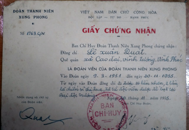 Giấy chứng nhận TNXP do đồng chí Vũ Kỳ ký ngày 20/11/1955