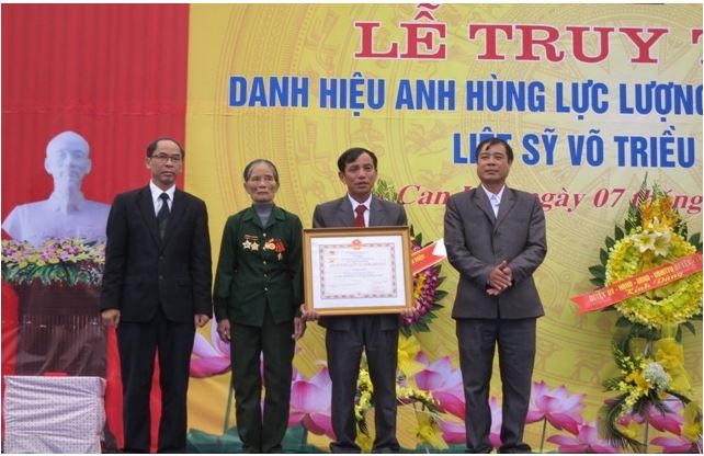 Thừa ủy quyền, đồng chí Nguyễn Thiện – Phó Chủ tịch tỉnh Hà Tĩnh trao danh hiệu Anh hùng LLVTND cho đại diện gia đình liệt sĩ Võ Triều Chung ngày 7/3/2015